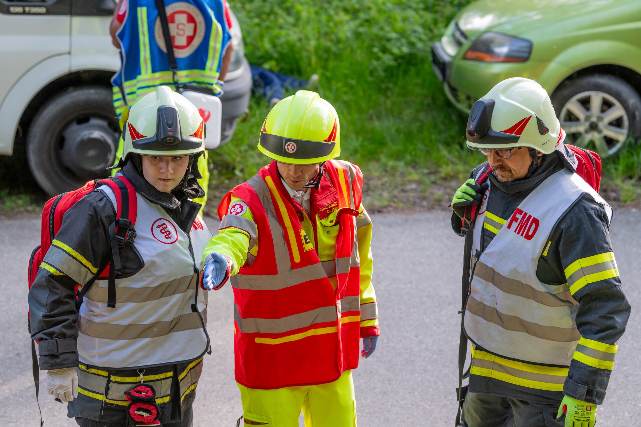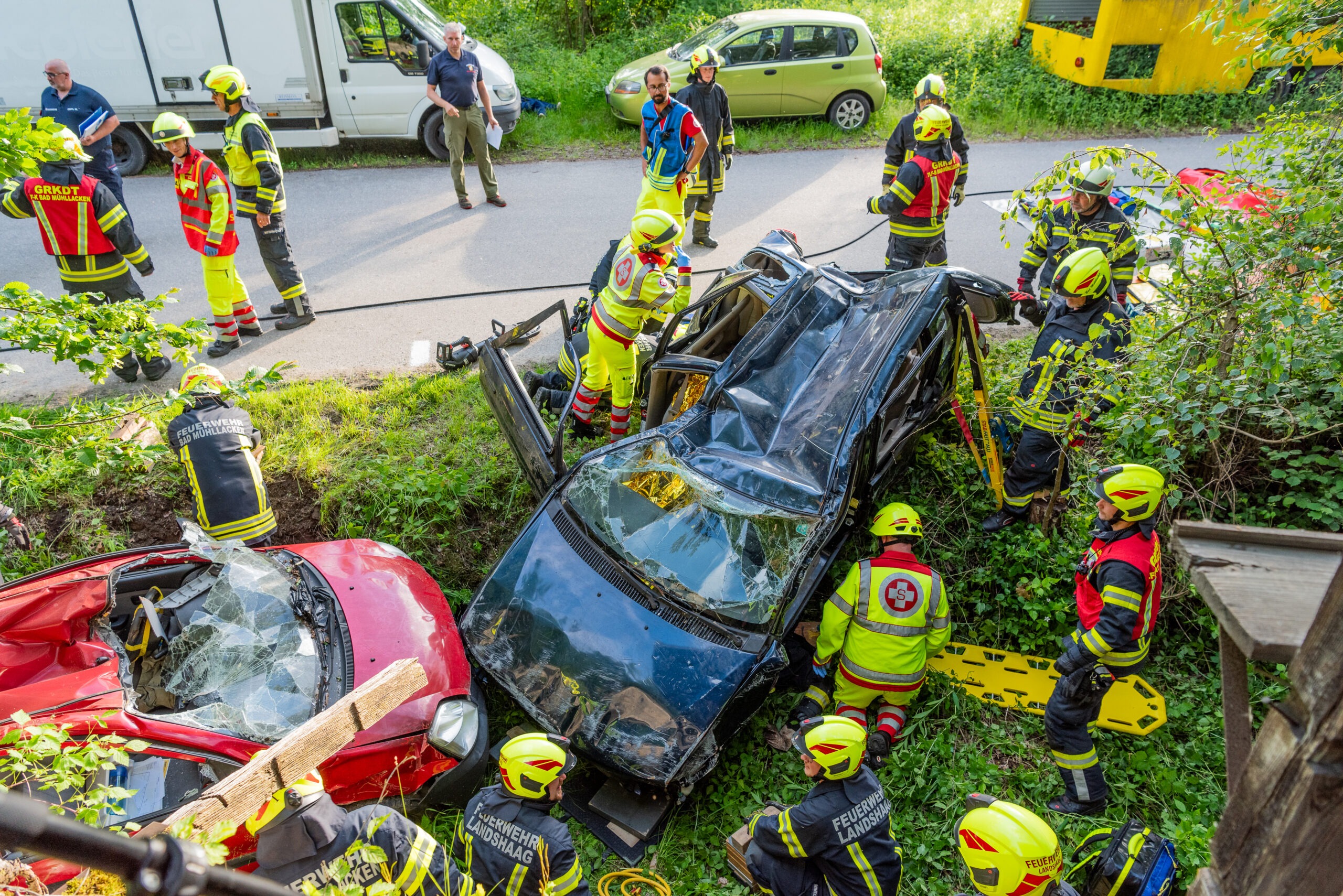 Am Einsatzort stellte sich folgendes Szenario heraus: zwei PKWs standen frontal zueinander im Straßengraben, wobei jeweils eine Person im Fahrzeug eingeklemmt war. Eine weitere Person kam unter einem der beiden PKWs zu liegen.